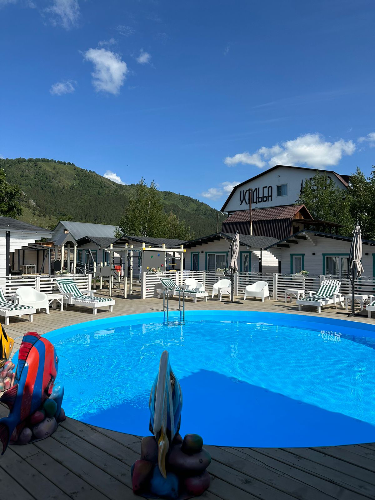 • с шезлонгами и зонтиками, вода  пресная, подогреваемый, пользование бассейном входит в стоимость, работает сезонно